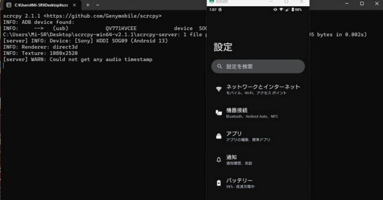音声も欲しい場合は、Scrcpyというものを入れます。